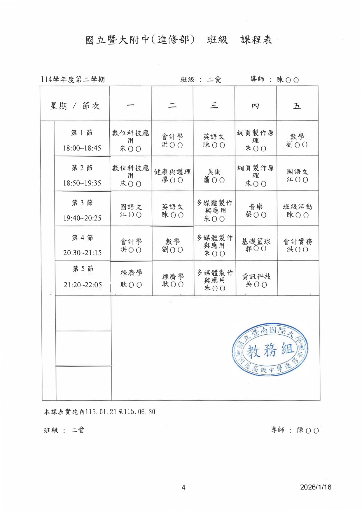 班級課表 / 二年愛班